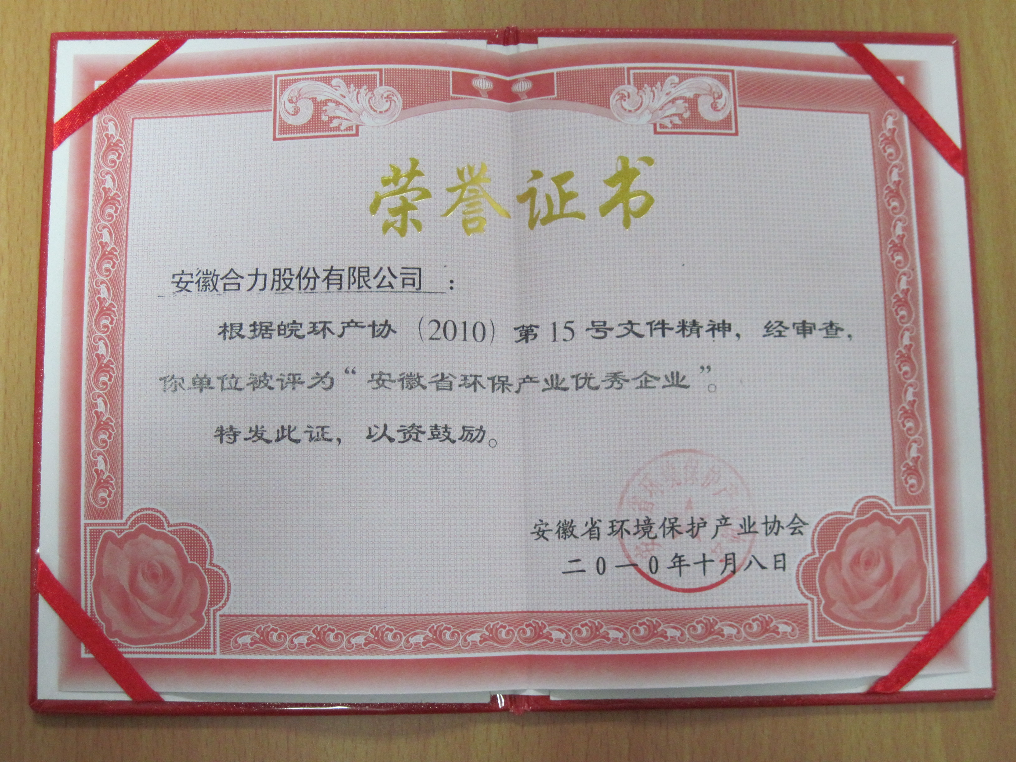 2010 安徽省環(huán)保企業(yè)優(yōu)秀企業(yè)證書