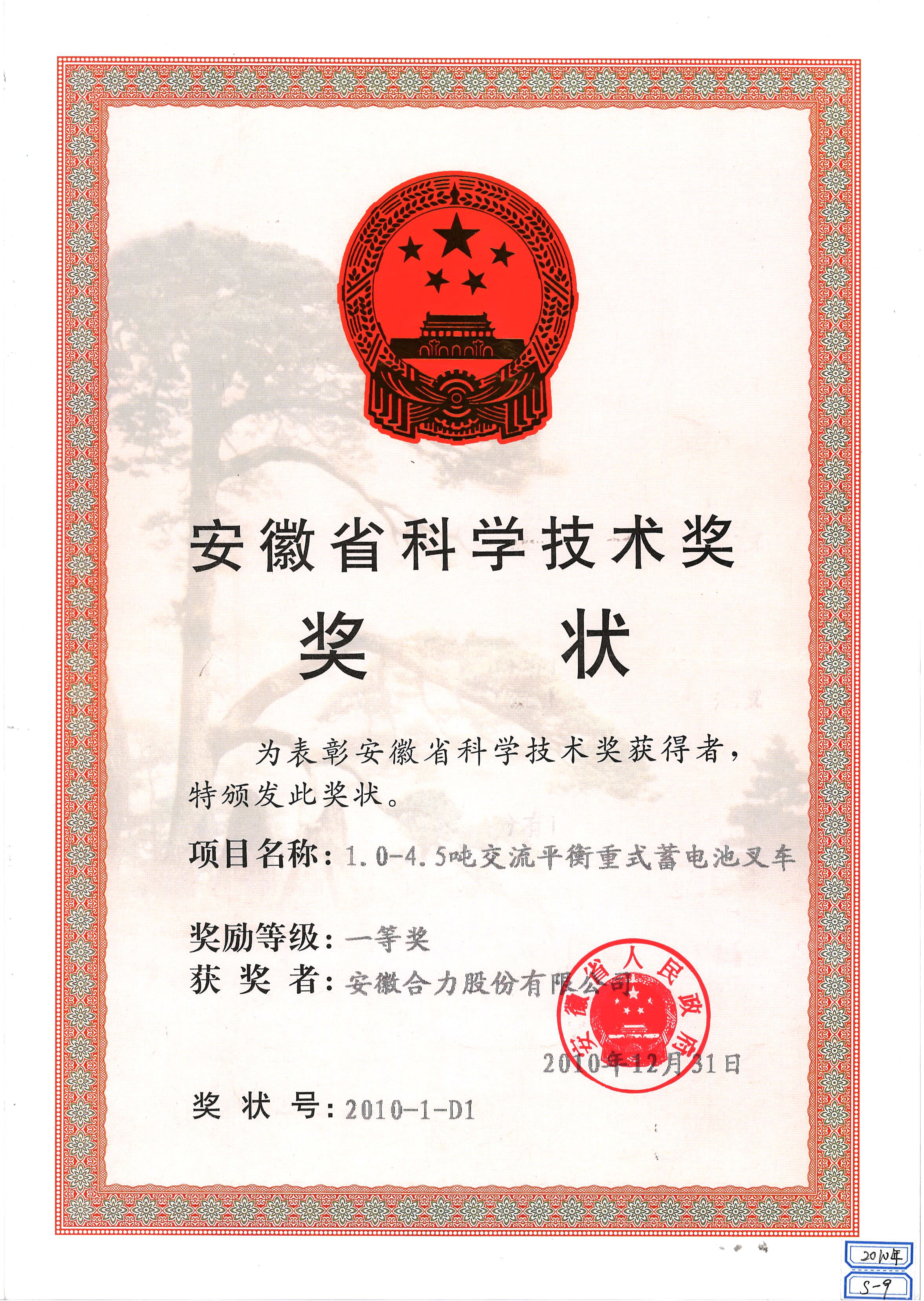 2010 安徽省科學技術獎獎狀:1.0-4.5噸交流平衡重式蓄電池叉車一等獎