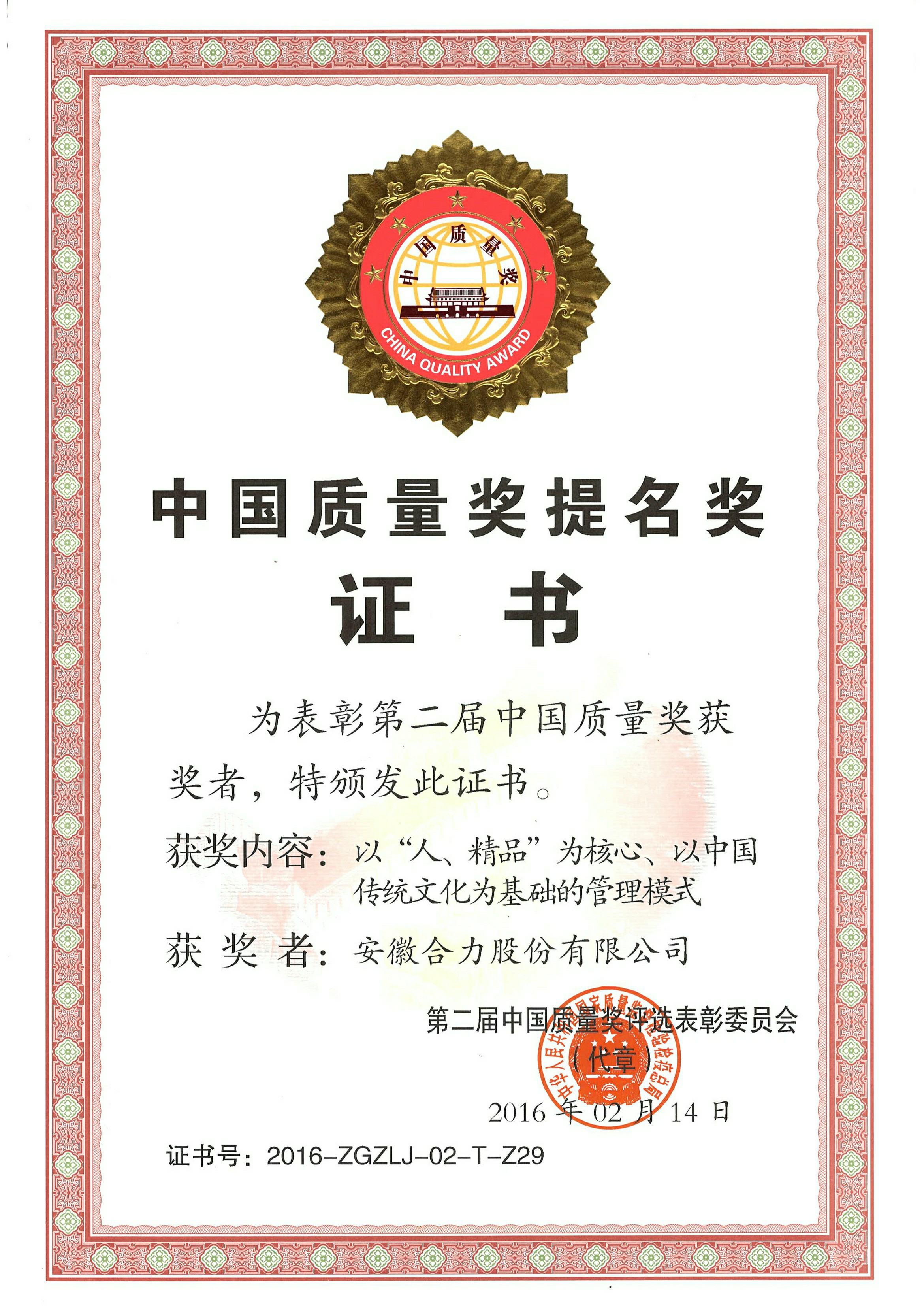 2016 第二屆中國質(zhì)量獎提名獎
