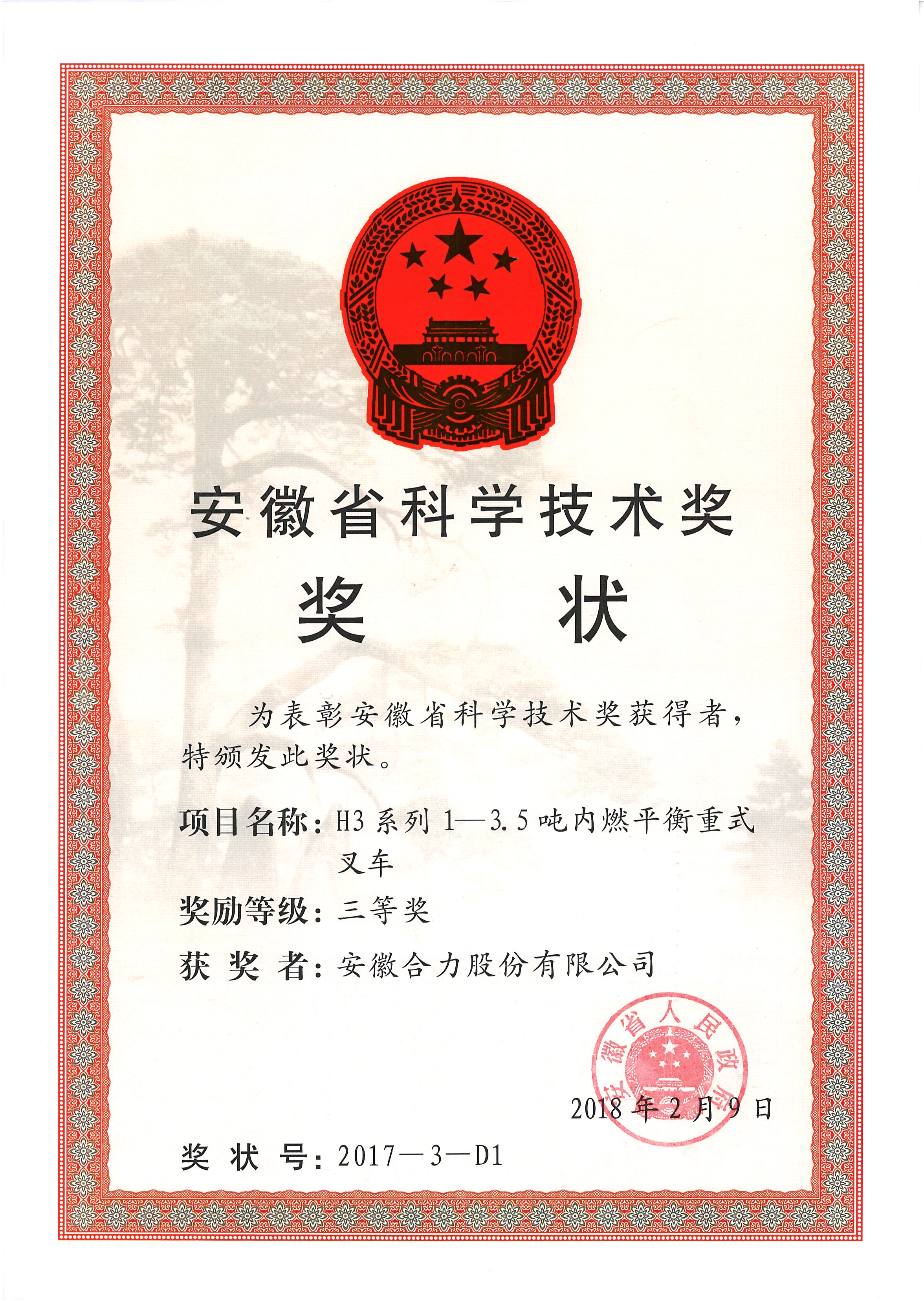 2018 安徽省科學技術獎三等獎 H3系列1-3.5噸內(nèi)燃平衡重式叉車
