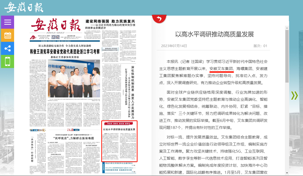 7月14日,《安徽日?qǐng)?bào)》在頭版中就安徽叉車集團(tuán)以高水平調(diào)研推動(dòng)高質(zhì)量發(fā)展情況進(jìn)行了報(bào)道。報(bào)道中表示,學(xué)習(xí)貫徹習(xí)近平新時(shí)代中國(guó)特色社會(huì)主義思想主題教育開(kāi)展以來(lái),安徽叉車集團(tuán)聚焦解難題辦實(shí)事,堅(jiān)持問(wèn)題導(dǎo)向,找準(zhǔn)切入點(diǎn)、發(fā)力點(diǎn),深入開(kāi)展調(diào)查研究,有力...
